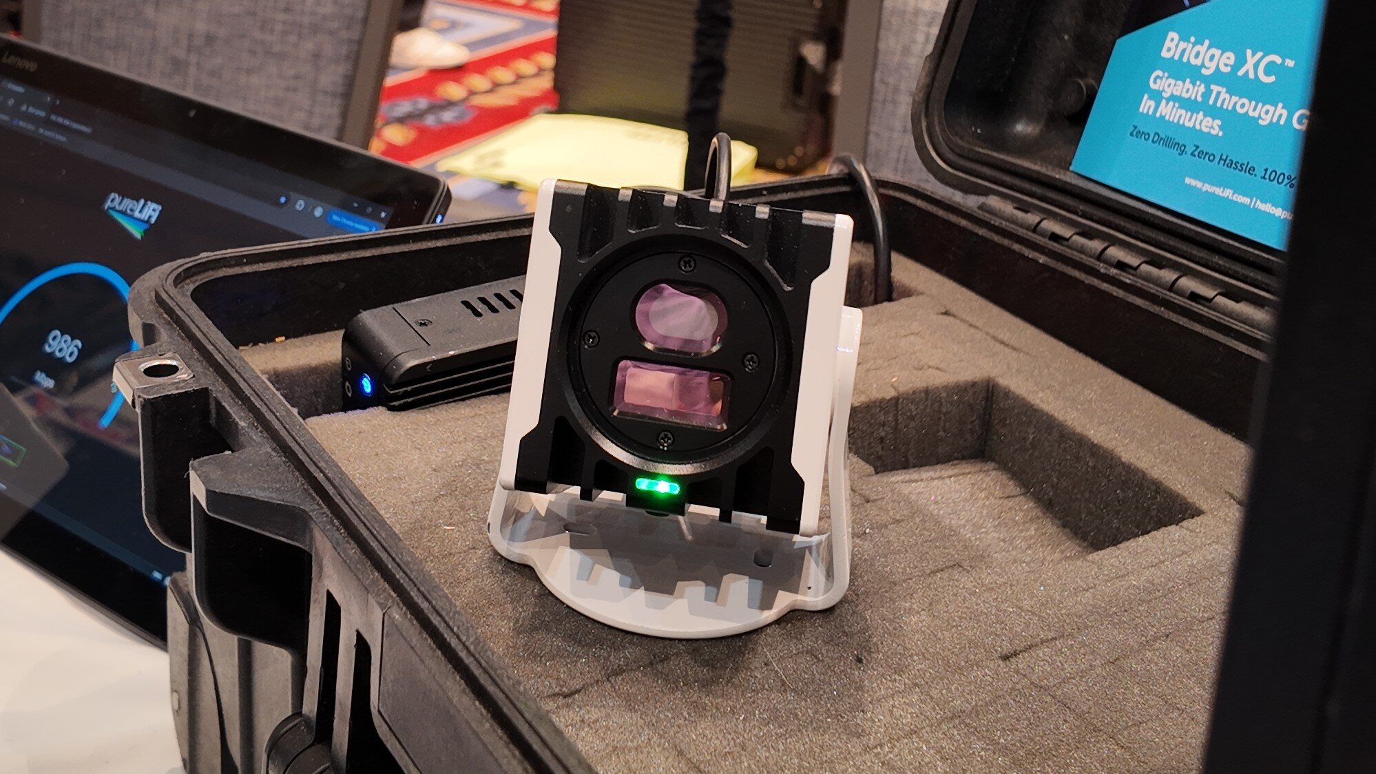 The company is also showing off the LiFi Cube Mini, which is basically your indoor access point for any Li-Fi-enabled devices. The signal it sends is largely line-of-sight (it can handle limited reflections), which pureLiFi is positioning as a privacy feature — there’s no way anyone is eavesdropping remotely, like they might with radio waves. And for people living in dense urban areas, this also means avoiding Wi-Fi interference from their neighbors.